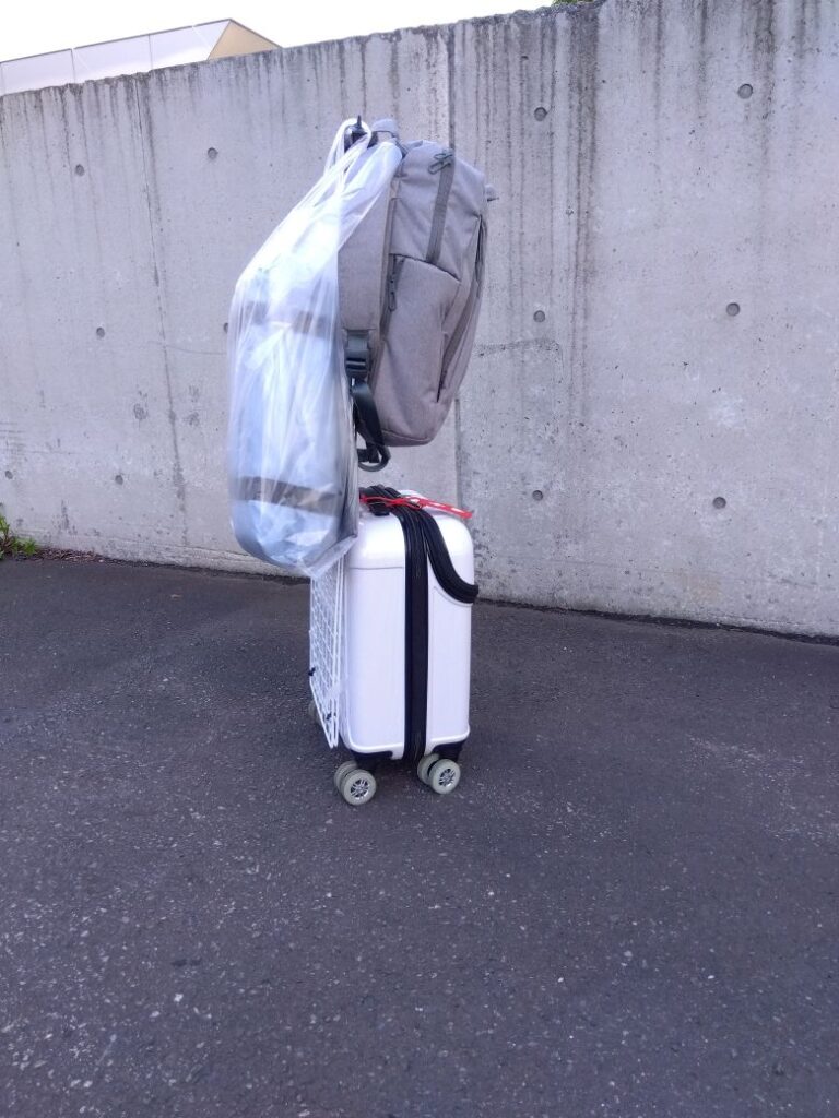 敷布が皺にならないように、段ボールを芯にして巻いたりしているのでかさばっていますが、重さはさほどでもありません。折り本スタンドも折り畳んでキャリーケースにシリコーンのケーブルバンドと養生テープで固定して、楽々と移動出来ます。ちなみにキャリーケースは、ノートPCを持ち運ぶために以前購入した、アクタスのトップオープンのSSサイズ(24リットル)ですが、これは優れもので、少し工夫して荷造りをすれば、上部の開口部からすべての荷物を出し入れでき、いちいちキャリーケースを横にする必要がありません。この日も大活躍でした。